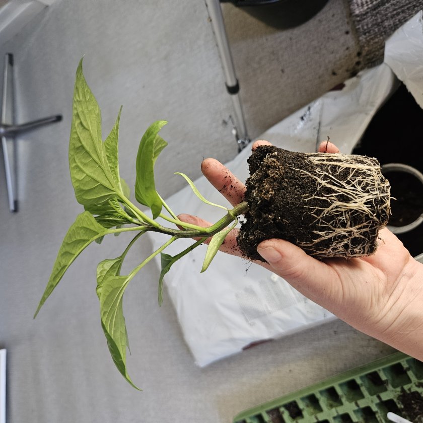 När dom små miniplantorna har fått fyra blad totalt ska dom omplanteras. Först får dom sina hjärtblad (två st) och sen får dom sina karaktärsblad (två stycken), när alla fyra syns är det dags för omplantering. Plantera dom en och en i krukor med gödslad jord av bra kvalité. När rötterna ser ut som bilden till höger är det dags för en till omplantering i större kruka. Sen låter ni plantorna växa till sig. Många toppar sina plantor och tar bort dom första blommorna. Det är inget vi märkt gör en större skillnad för odlingen. Dom kommer antagligen att börja blomma inomhus i sina krukor men det ser vi bara som en fördel för tidigare skörd.