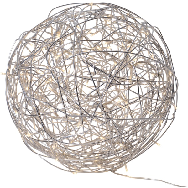 Dekorativ silverfärgad version av Trasselbollen för både inom- och utomhusbruk. Inuti dekorationen finns en LED-ljusslinga som avger ett varmvitt sken. Designad av Charlotte Falck.