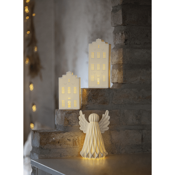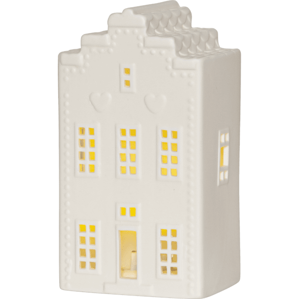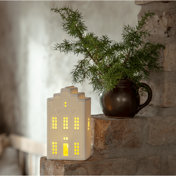 Ett vackert kanalhus i keramik för dekoration i hemmet. Lyser och sprider ett fint sken. För inomhusbruk.