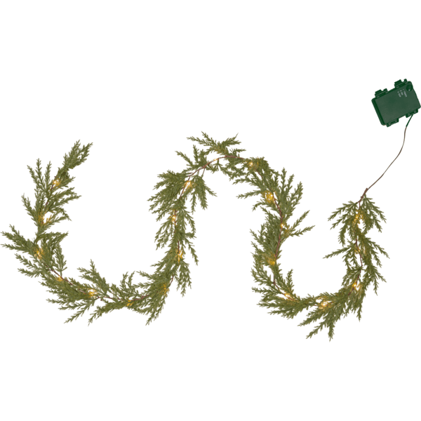 Thuja girlang är 180 cm lång och har grenar som ser ut som tujabarr. Dessa är gjorda i PE material, vilket är ett bra miljöval. Med 20 varmvita ljuspunkter går den att använda som en girlang på ett räcke utomhus eller som en bordsdekoration inomhus. I familjen Thuja har vi även bordsgran och krans. Denna girlang drivs av 3 AA batterier och har även timerfunktion och när brytaren är på timerläget lyser girlangen i ca 30 dagar. Batterier ingår ej.