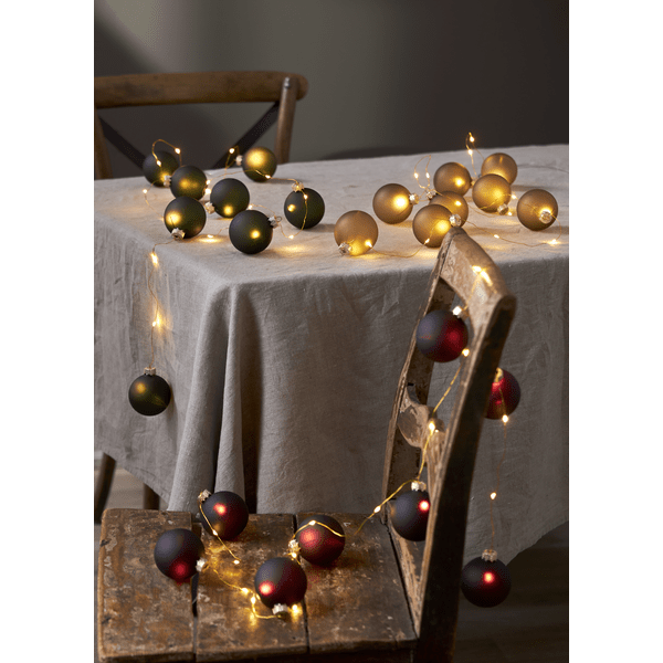 Vacker batteridriven ljusslinga med 8 st mörkt gröna glaskulor. Mässingsfärgad slinga med små ljuspunkter i varmvit LED. Perfekt för tex bordsdekoration och julgransbelysning och ger en härlig stämning i hemmet. För inomhusbruk.