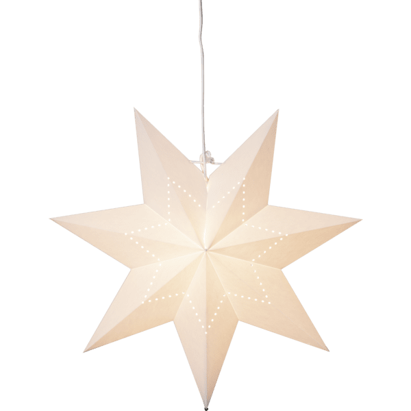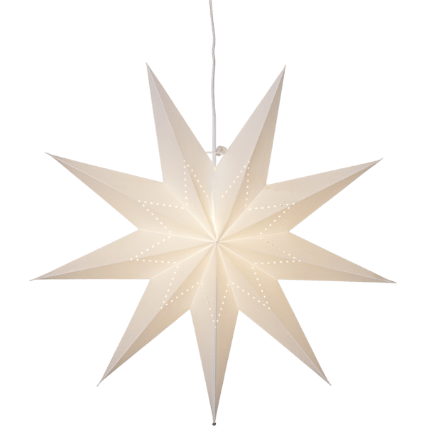 Vit pappersstjärna med hålmönster i form av en stjärna. Dekorera med till jul och advent. Häng en eller flera stjärnor tillsammans i ett fönster eller mot en vägg. Stjärnan har plats för en ljuskälla och det följer med ett upphäng för E14 lampa. Denna produkt har FSC®-märkning.