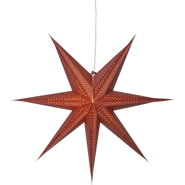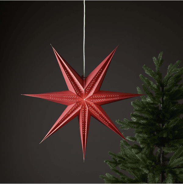 Nätt röd pappersstjärna med en dekorativt hålmönster och vikning. Modern adventsstjärna att dekorera fönster eller luta mot en vägg. Dekorera till advent och det ger en härlig julstämning.