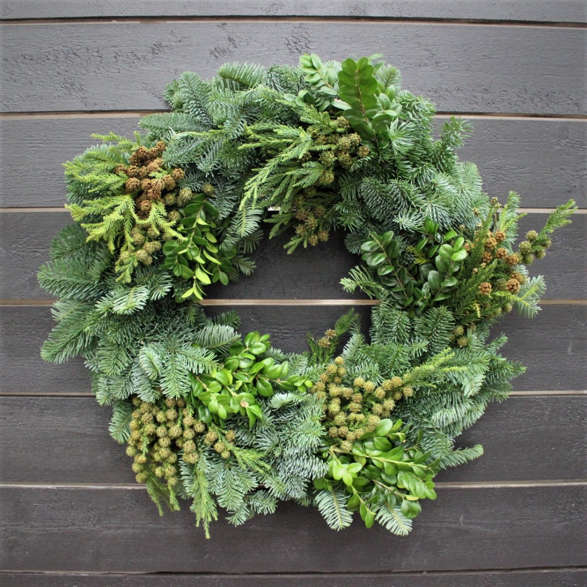 Vacker krans att sätta på dörr, vägg eller liknande.Bunden med: Nobilis, mjuken, cypress och buxbomStomme: HalmDiameter: 45cm