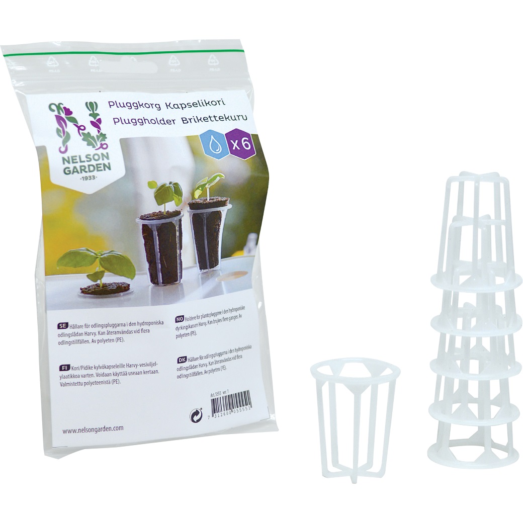 Refill-produkt till den hydroponiska odlingslådan Harvy. Pluggkorgarna används som hållare för odlingspluggarna. Kan återanvändas vid flera odlingstillfällen.