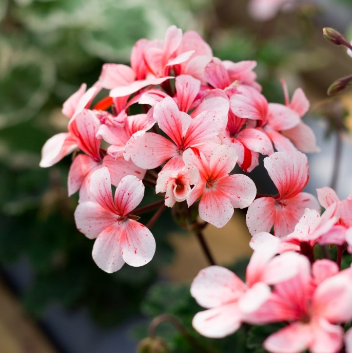Pelargon ’Clown’ är en underbar och lekfull sort med blommor som har vit bottenfärg, laxrosa mitt och dekorativa prickar. De mjuka färgövergångarna och det livliga mönstret ger blommorna ett charmigt och iögonfallande uttryck. Sorten tillhör gruppen äggskalspelargoner, där varje blomma får sitt eget unika utseende.