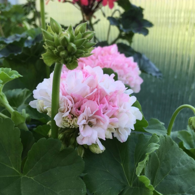 De fyllda blommorna sitter samlade i vackra klasar och skapar ett rikt, mjukt och romantiskt intryck. Kombinationen av den ljusa bottenfärgen och de rosa tonerna ger plantan ett lätt och harmoniskt utseende som passar lika bra i kruka som i samplanteringar.