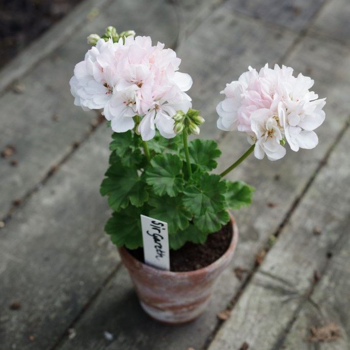 Pelargon ’Sir Gareth’ är en underbar och ljuvlig dubbelblommande äggskalspelargon med blommor i vitt och rosa, där prickar och stänk flyter ut i mjuka övergångar som om de vore målade med akvarell. Det konstnärliga mönstret ger varje blomma ett levande och elegant uttryck och gör sorten till ett verkligt blickfång.