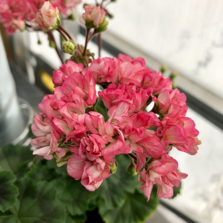 Dubbla, små blommor som skiftar från vitt till rosa, relativt småbladig.