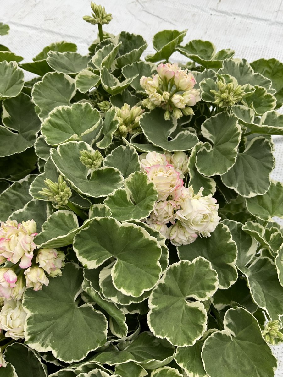 Rosavita blommor och ett bladverk som är grönt med vita kanter.