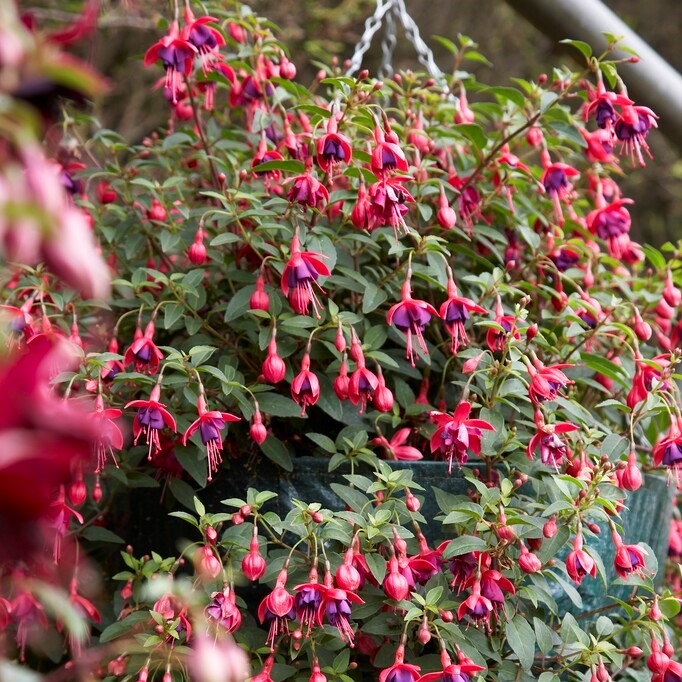 Här har vi en fuchsia med röda kronblad och lila kjol. Växtsättet är hängande, vilken skönhet!