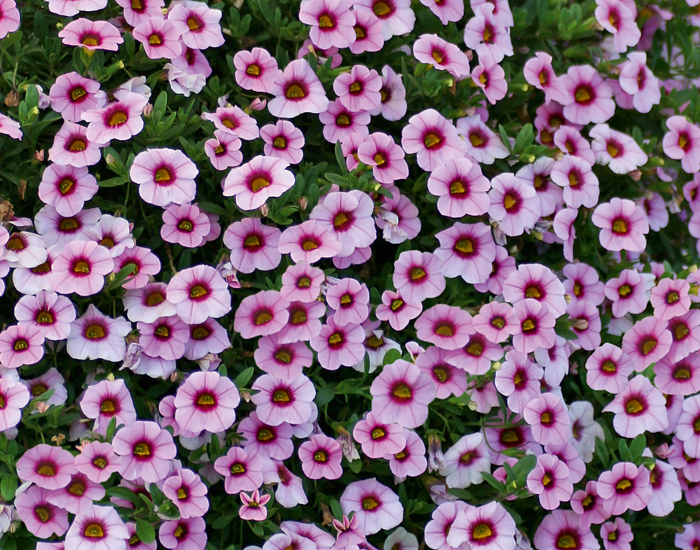 Här får vi njuta av ljusrosa blommor med en mörkare mitt lver ett grönt bladverk.