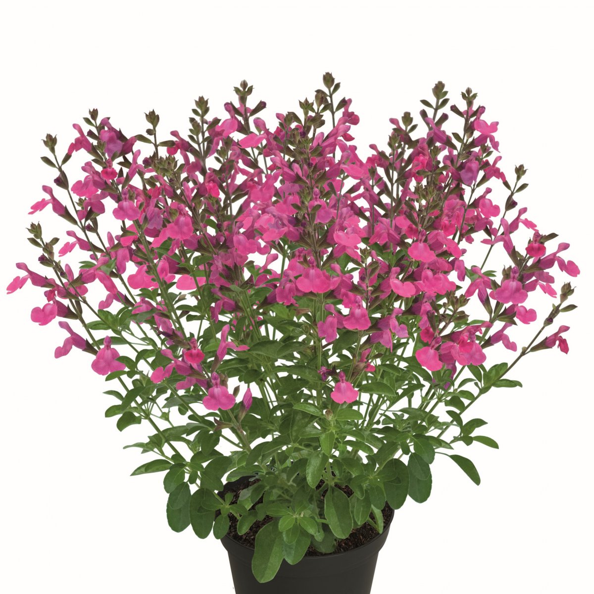 Salvia ’Visional Pink’ är en ljuvlig sommarblomma som blommar med klart rosa blommor på upprätta stjälkar. Blommorna är små och tillsammans bildar de en fluffig och sirlig planta.