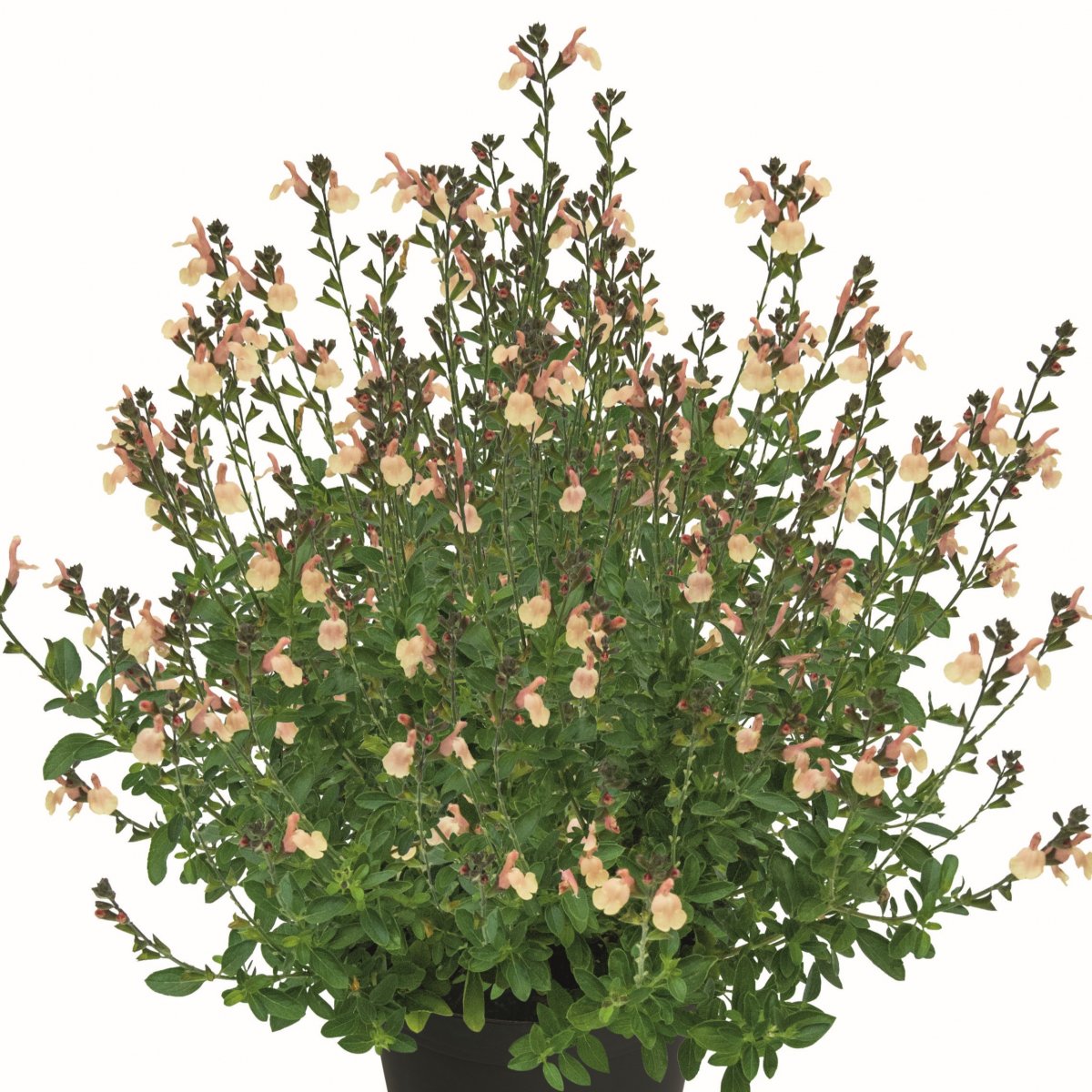 Salvia ’Visional Cream’ är en ljuvlig sommarblomma som blommar med cremefärgade till ljust pastelligt laxrosa blommor på upprätta stjälkar. Blommorna är små och tillsammans bildar de en fluffig och sirlig planta.