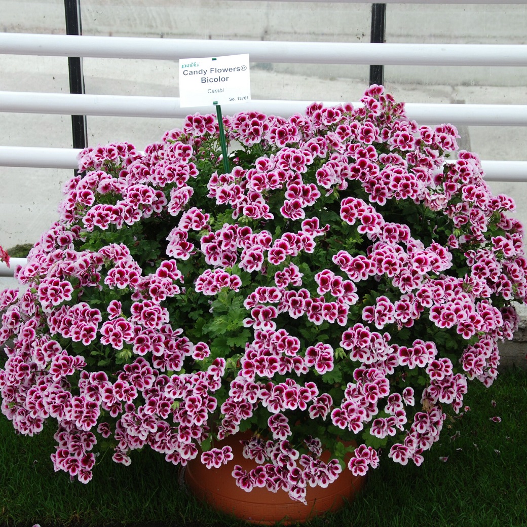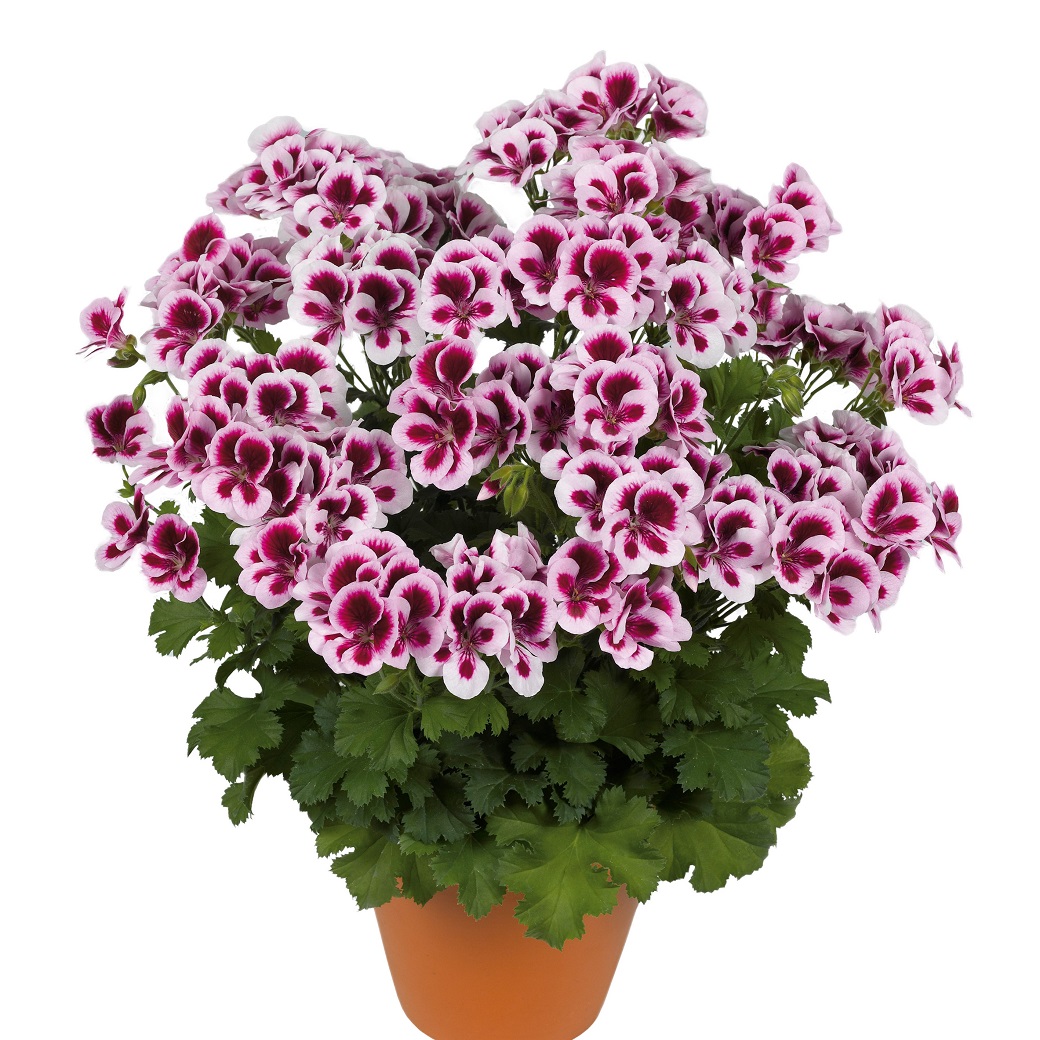 En mycket rikblommande pelargon som får ett hav av lila blommor med vit kant över ett grönt bladverk.