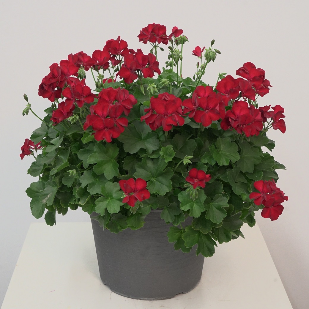 Hängpelargon ’Marcada Dark Red’ är en robust sort med ett halvthängande växtsätt och mörkt röda blommor. Den fyller snabbt ut balkonglådor och krukor och ger ett jämnt och frodigt uttryck under säsongen.