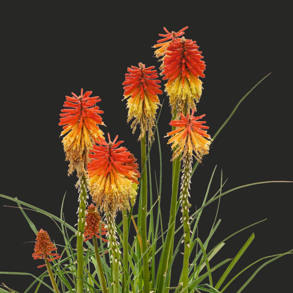 Fackellilja ’Day Break’ blir cirka 50 cm hög och får stora blomsterspiror i eldiga nyanser av orange och gult som verkligen lyser upp planteringen. Blommorna sitter högt ovanför det gräsliknande bladverket och ger plantan ett exotiskt utseende.
