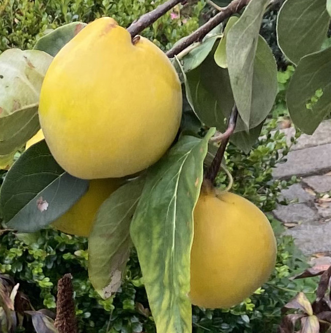 gul 10cm stor frukt som doftar, rå fast vitt fruktkött, rå syrlig smak, tillagad söt smak, tillagad mjukt fruktkött, mognar okt-nov, vitrosa, maj-juni, 3-5m, gul höstfärg, hushållsfrukt, sol, halvskugga, zon 1-4 (5), självfertil.