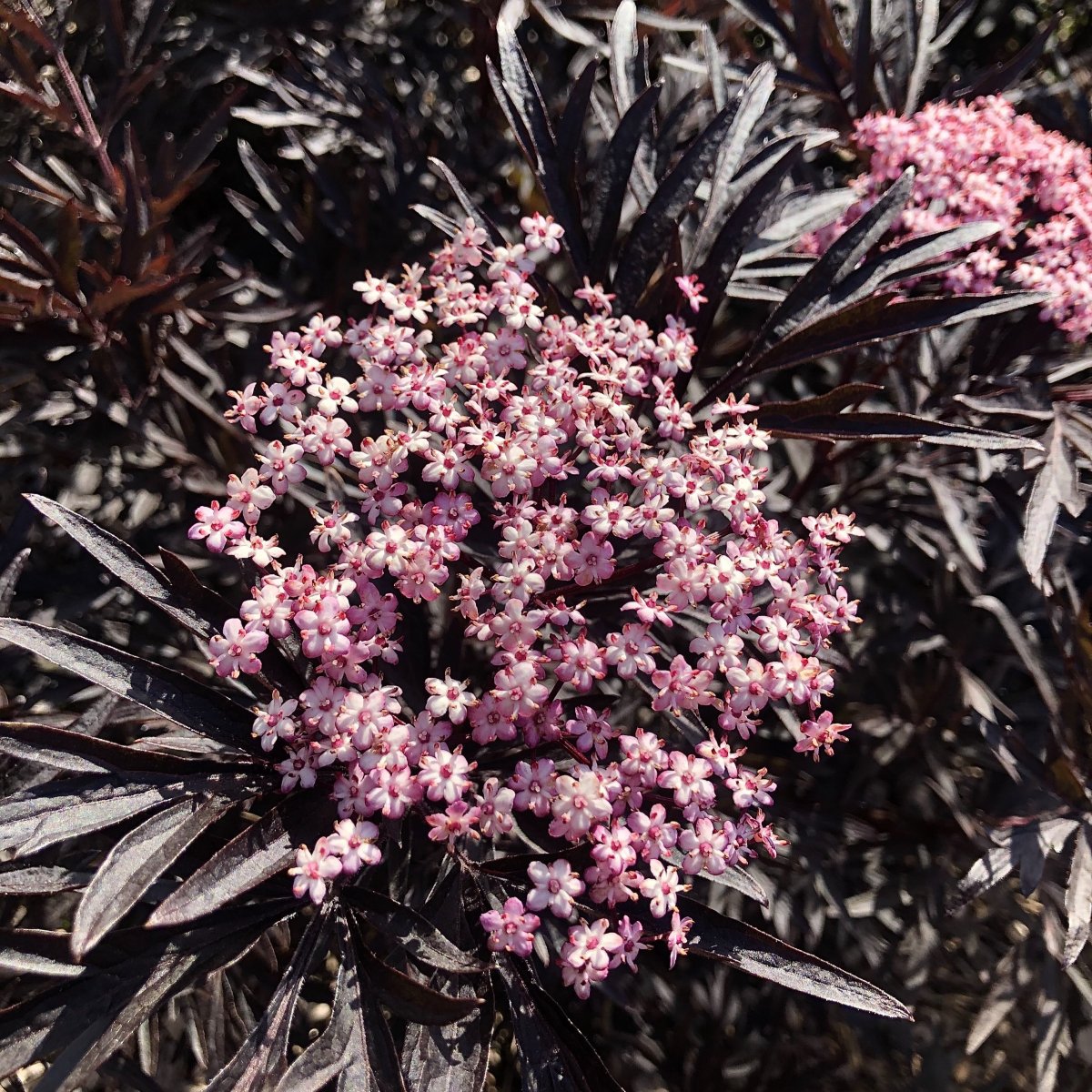 vita m rosa kant, doft, flikiga mörkt körsbärsröda blad, svarta bär, 1,5m, sol-halvsk, zon 1-4.