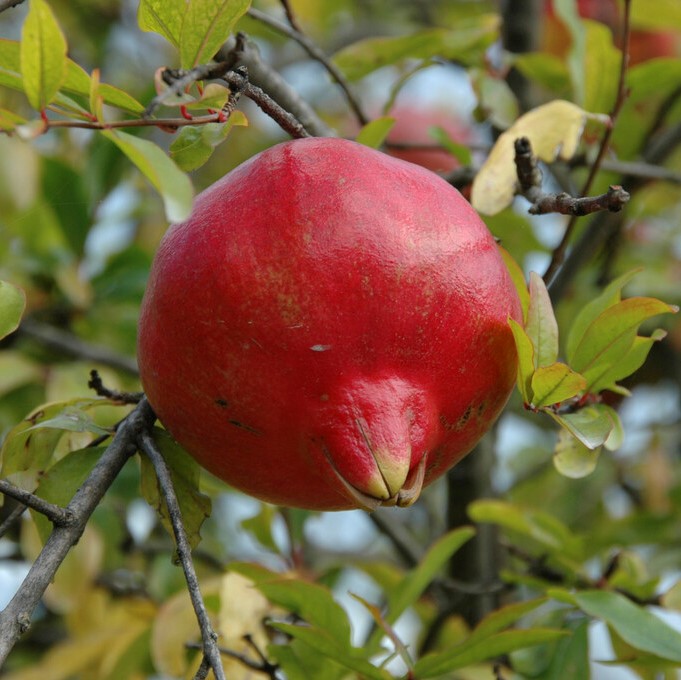 rödorange stor, saftigt rött fruktkött, syrlig fruktig smak, mognar sept-okt, orange, juni-aug, 1-2m, gul höstfärg, sol, ute i soligt läge eller i växthus, tas in på vintern eller i uppvärmt växthus, självfertil.
