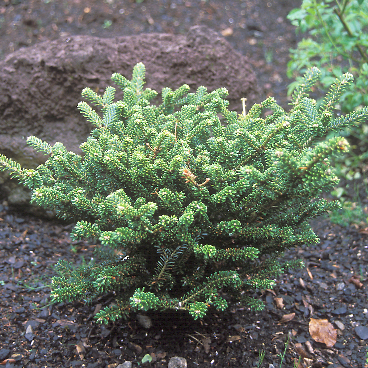 Abies koreana 'Oberon', även kallad Koreagran 'Oberon', är en dvärgformad, kompakt gran som växer långsamt och når en höjd på cirka 1 meter. Dess barr är mörkgröna och glänsande, med en ljusare undersida som ger en subtil kontrast. Växten har ett rundat, tätt växtsätt som gör den idealisk för mindre trädgårdar, stenpartier eller krukodling.'Oberon' trivs bäst i väldränerad och lätt sur jord och föredrar en solig till halvskuggig placering. Den kräver minimalt med underhåll men behöver regelbunden vattning under torra perioder för att frodas. Den är ett utmärkt val för den som söker en dekorativ och lättskött barrväxt som passar i många olika trädgårdsmiljöer.