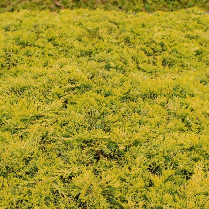 Juniperus horizontalis 'Golden Carpet', eller Amerikansk Krypen, är en lågväxande och spridande marktäckare med en ljus och livfull gulgrön färg som behåller sin lyster året om. Under vintern kan barren få en svag nyans av lila beroende på temperaturen, vilket tillför en extra dimension av skönhet. Den växer till en höjd på cirka 30 cm och kan sprida sig över breda ytor, vilket gör den perfekt som marktäckare i trädgården.
