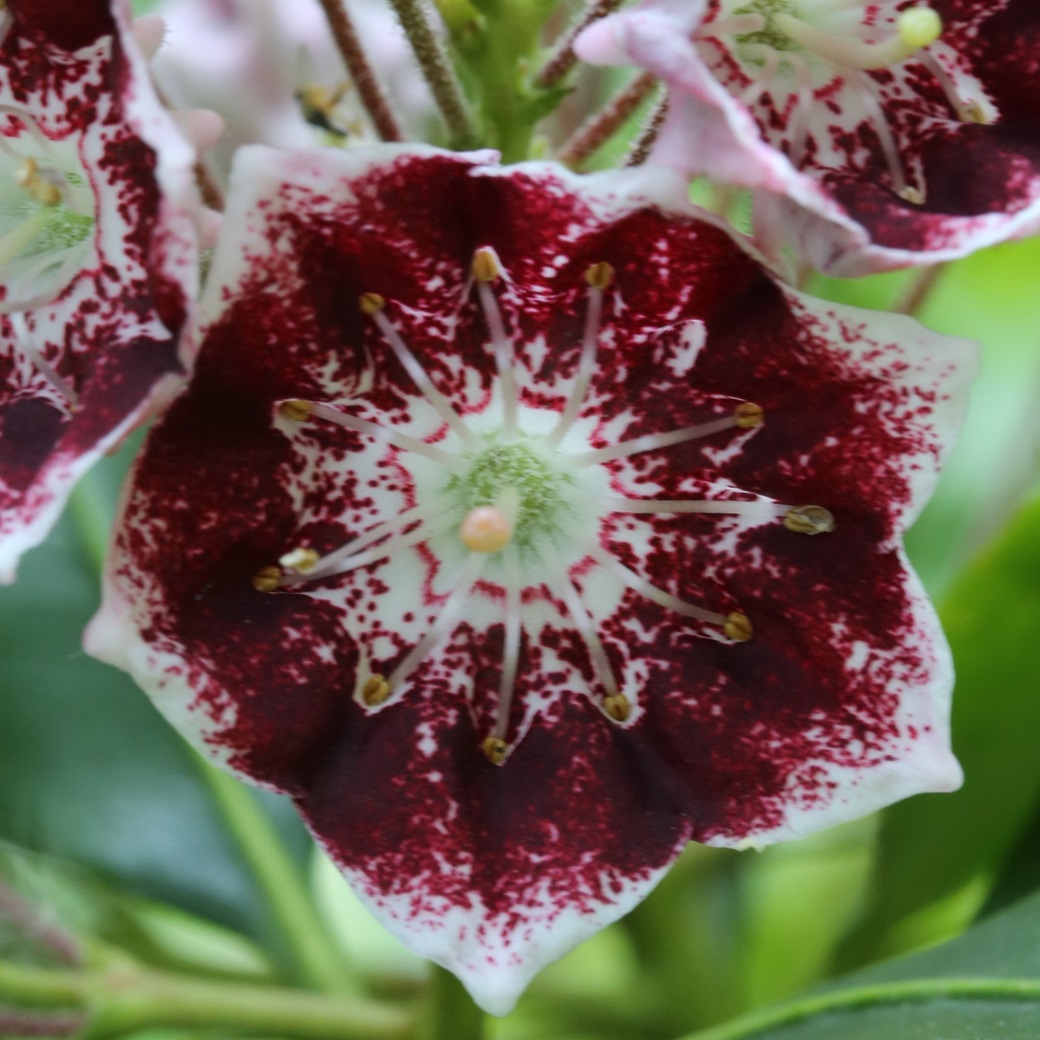 En sober Kalmia med klasar av mycket mörkt vinräda, nästan svarta, skålformade blommor med vit till gråvit kant och mitt. Utblomningen av klasarna sker successivt så det finns alltid vackra perforerade ljusa knoppar samtidigt som utslagna blommor vilket skapar en fin kontrast mot dom mörka blommorna. Mörkgröna elliptiska städsegröna blad.