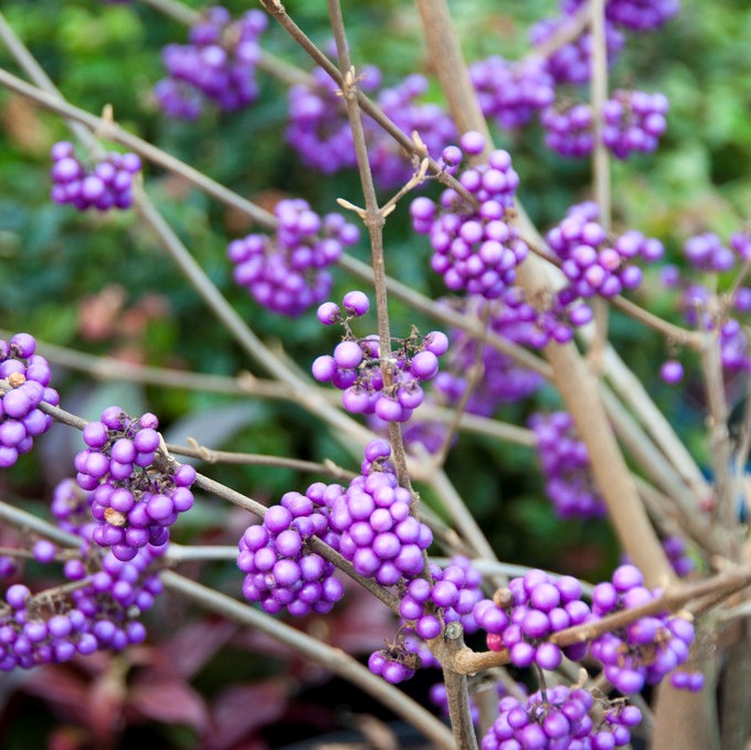 Callicarpa bodinieri var. giraldii Profusion, även kallad Kinesiskt Glasbär, är en prisbelönt buske som har erhållit utmärkelsen Award of Garden Merit (AGM) från RHS, vilket bekräftar dess pålitlighet och kvalitet. Under sommaren, från juni till juli, pryds den av små, lila blommor som lockar pollinatörer. Till hösten utvecklas de lila bären som är tätt samlade längs grenarna och ger busken ett unikt och dekorativt utseende. Dess bladverk skiftar från grönt till en vacker gul höstfärg och skapar ett fantastiskt färgspel under säsongen.Denna upprättväxande buske når en höjd på cirka 1–1,5 meter och är perfekt som solitär eller i blandade planteringar. Plantera i väldränerad, näringsrik jord och välj en plats i sol till halvskugga för bästa resultat. Beskär på våren för att främja ny tillväxt och bibehålla en kompakt form. Callicarpa Profusion är en lättskött buske som tillför färg och intresse från sommar till sen höst och är en utmärkt tillgång för varje trädgård.