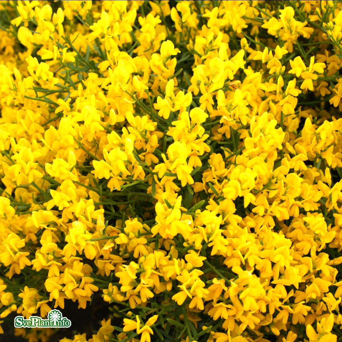 | Små klargula ärtformade blommor i rik mängd, gul knopp |