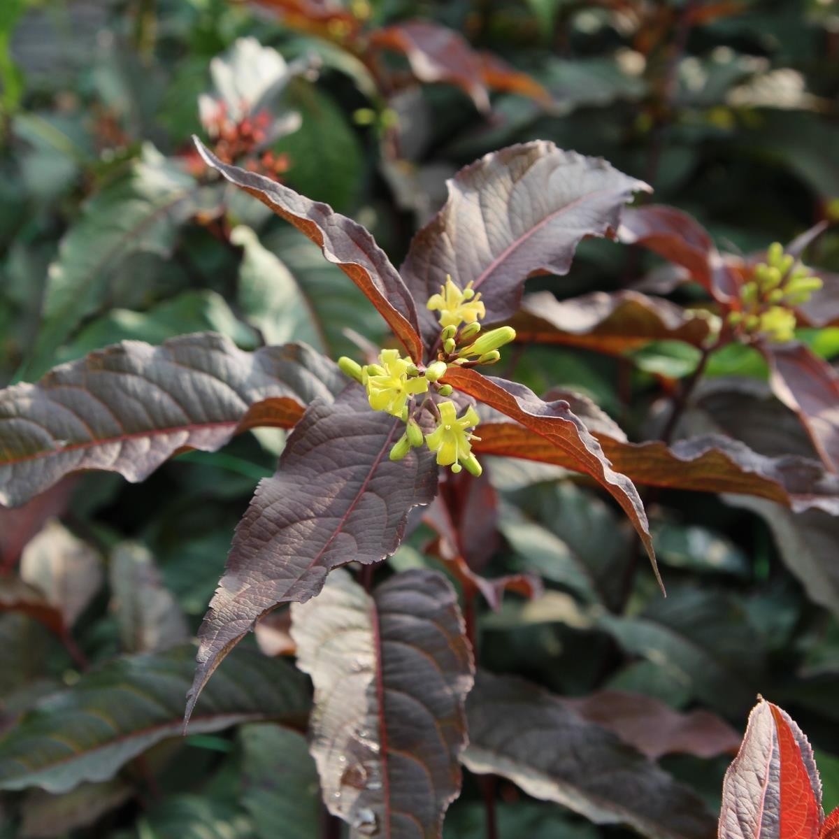 Tuote Kuvaus:gul, juni-sept, mörkröda blad, röd höstfärg, 1m, sol, halvskugga, zon 1-4.
