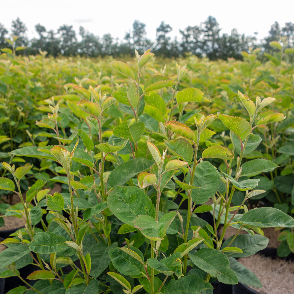 Amelanchier canadensis 'Glenn Form', marknadsförd under namnet Rainbow Pillar®, är en upprättväxande, mångsidig buske eller litet träd som erbjuder flera säsongsmässiga skönheter. Under våren täcks den av vita, stjärnformade blommor som inte bara är estetiskt tilltalande utan också lockar pollinatörer. Efter blomningen utvecklas ätliga, rödblå bär som uppskattas av både människor och fåglar. Bladen är gröna och ovala under sommaren, men på hösten övergår de i en spektakulär orangeröd färgpalett, vilket ger ett slående inslag i trädgården.