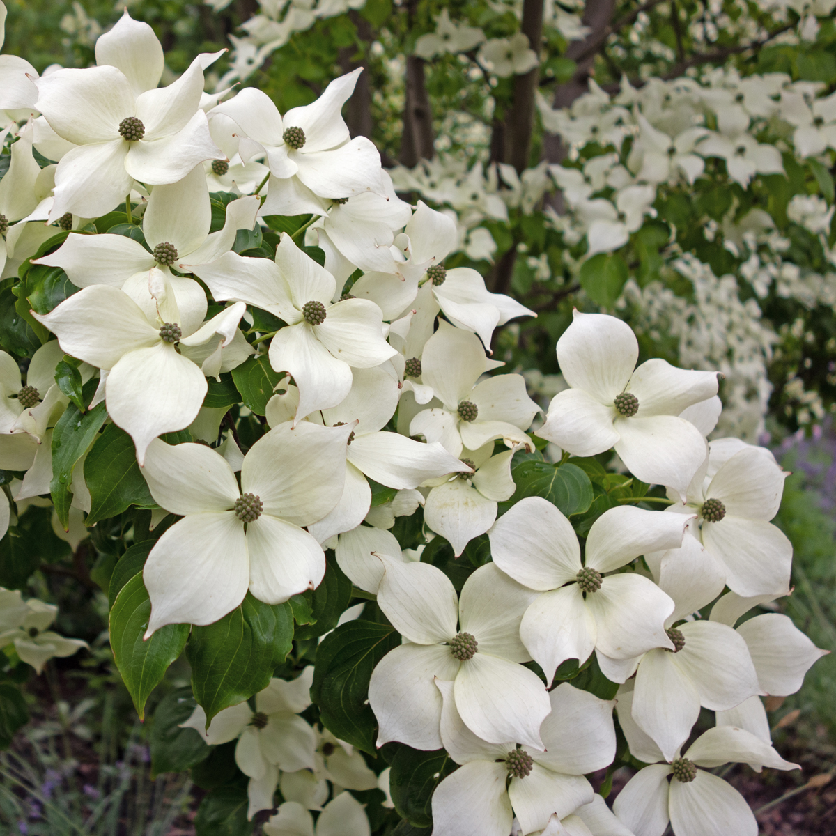Koreansk blomsterkornell (Cornus kousa) är ett vackert litet träd eller en buske som når en höjd på 2–4 meter och utvecklar en bred, elegant krona. Under försommaren blommar den med små, gulgröna blommor som omges av stora, vita högblad som bildar en blomställning på upp till 10 cm i diameter. Dessa högblad ger växten en sofistikerad och iögonfallande blomning som varar i flera veckor och lockar pollinatörer som bin och fjärilar.På hösten förvandlas de mörkgröna bladen till en praktfull rödgul färg, och samtidigt utvecklas de dekorativa röda bären som påminner om små jordgubbar. Dessa bär är både prydnadsfulla och uppskattade av fåglar. Koreansk blomsterkornell trivs i väldränerad, näringsrik jord och föredrar en solig till halvskuggig placering. Den är lättskött och kräver minimal beskärning, men döda eller skadade grenar kan tas bort under vårvintern eller efter blomningen. Cornus kousa är en elegant och mångsidig växt som ger skönhet och liv åt trädgården året runt.