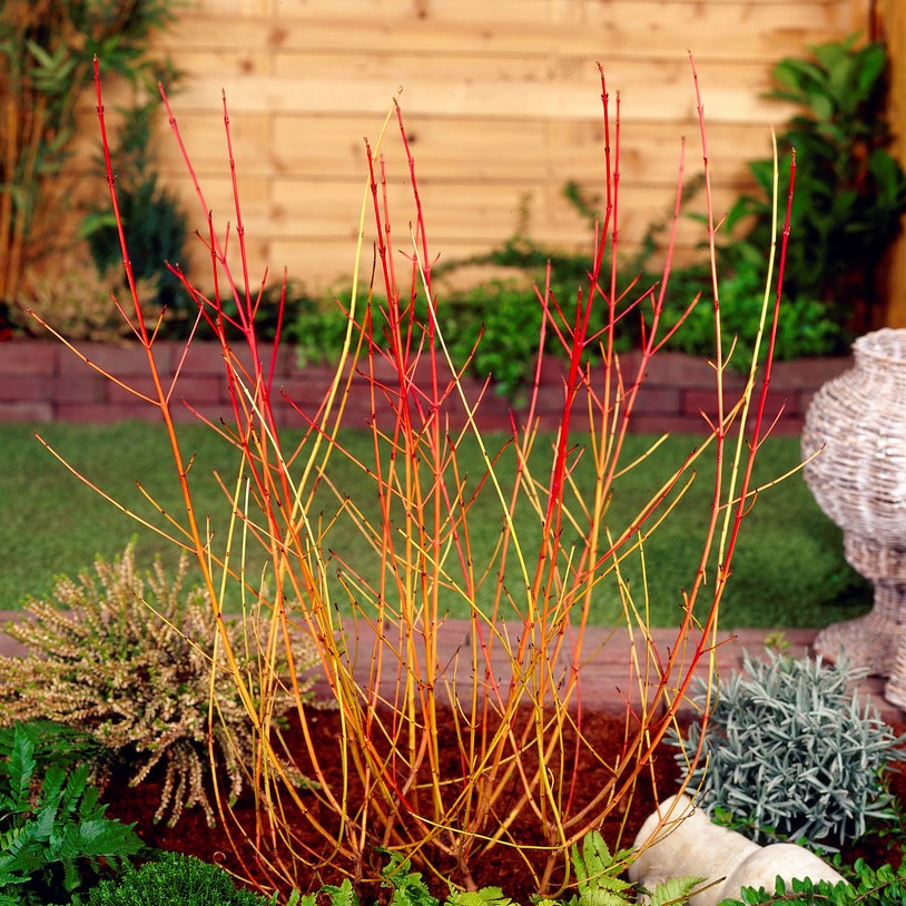 vit, maj-juni, orangerödgula grenar, orangegul höstförg, 1-1,5m, sol, halvskugga, zon 1-5.