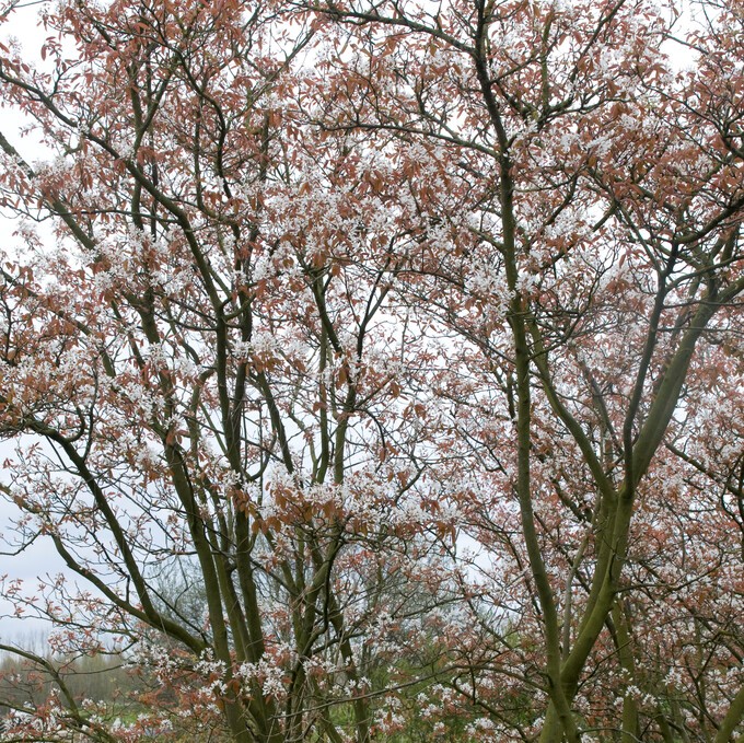 **Amelanchier × grandiflora 'Robin Hill'**, ofta kallad storblommig häggmispel, är en elegant och mångsidig växt som ofta odlas som ett flerstammigt buskträd eller ett mindre träd. I maj pryds den av stora, vita blommor som utvecklas från svagt rosa knoppar. Blommorna, som är större än hos många andra sorter inom arten, sitter i klasar och ger ett imponerande och iögonfallande uttryck. De är dessutom diskret doftande och lockar pollinerare som bin och fjärilar. Bladverket börjar som kopparfärgat på våren innan det övergår till en frisk grön ton under sommaren. På sensommaren utvecklas små, svartröda ätliga bär som är både dekorativa och goda att använda i sylt och bakverk.'Robin Hill' har tilldelats **RHS Award of Garden Merit (AGM)**, vilket är en garanti för dess pålitlighet, odlingsvärde och estetiska kvalitet. Den når en höjd på 5–6 meter med ett smalt och upprätt växtsätt som breddar sig något med åldern. På hösten bjuder trädet på ytterligare skönhet när bladen skiftar till nyanser av gult och orange. Den trivs bäst i sol till halvskugga och föredrar väldränerad jord. Med sina storblommiga klasar, ätliga bär och prydnadsvärde under flera säsonger är 'Robin Hill' ett perfekt val för trädgårdsentusiaster som vill ha ett lättskött träd med säsongsbetonad variation och unik karaktär.