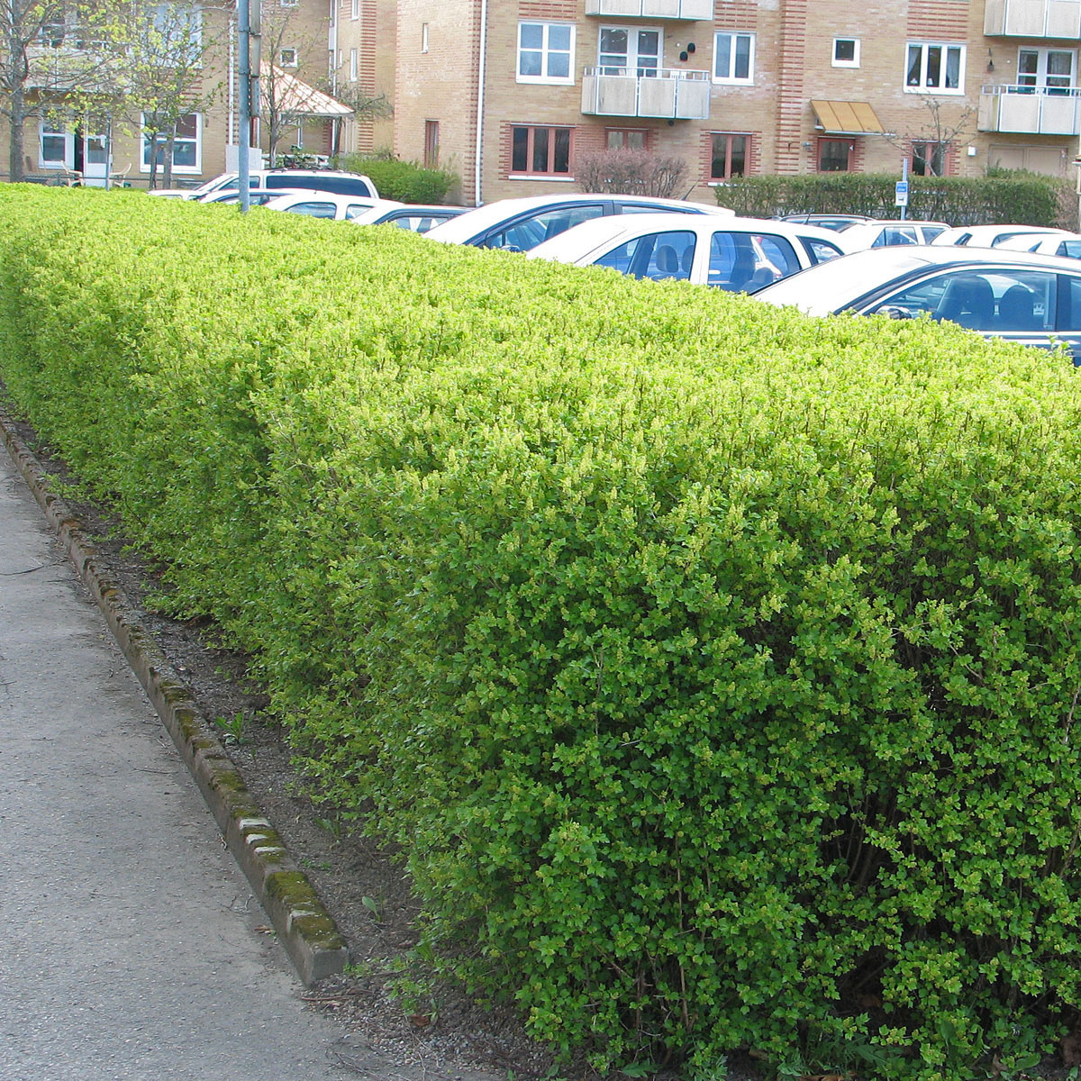 Viktigt med uppbyggnadsbeskärning, klipp sidorna längs häcken redan vid första året och fortsätt åren därpå. Toppen klipps samtidigt, spara cirka en tredjedel av tillväxten per klippning. Detta för att häcken ska bli stabil, tät och klara snötyngd utan att falla isär. När önskad höjd är uppnådd klipps häcken i samma nivå varje år.