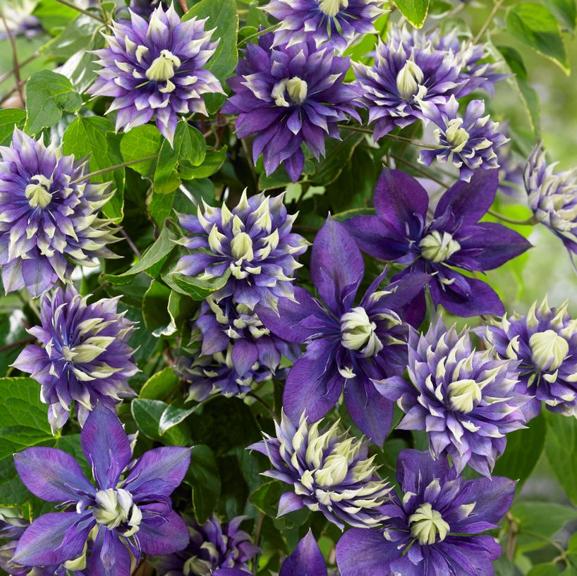 Tuote Kuvaus:Clematis florida 'Taiga', även känd som paradisklematis, är en imponerande och exotisk klematis som tillför ett dramatiskt inslag i trädgården med sina unika, dubbla blommor. Blommorna har en intensivt violettblå färg med ljusa, nästan limegröna spetsar på varje kronblad, vilket skapar en fascinerande och tropisk känsla. Med sin ovanliga form och färg är 'Taiga' ett verkligt blickfång som drar till sig uppmärksamhet och blir en konversationspunkt i trädgården. Blomningen sträcker sig från juni till september, och varje blomma är cirka 8-10 cm i diameter.