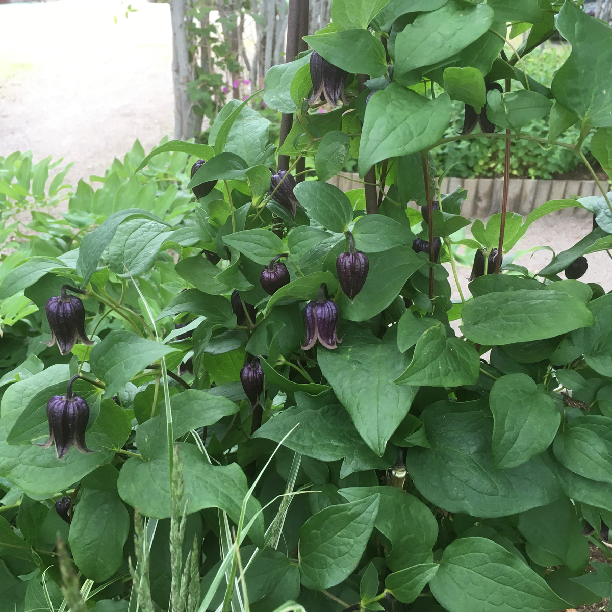 Denna sort har ett kraftigt, klättrande växtsätt och kan nå höjder på 2-3 meter, vilket gör den idealisk för spaljéer, pergolor och staket. Bladen är friskt gröna och har en något flikig struktur som bidrar till växtens frodiga utseende. Clematis ianthina (fusca var. violacea) är lättskött och trivs bäst i väldränerad jord på en plats med sol till halvskugga. För trädgårdsentusiaster som letar efter en annorlunda och iögonfallande klematis med exotisk charm är denna sort ett perfekt val som tillför färg och karaktär till sensommarens trädgård.