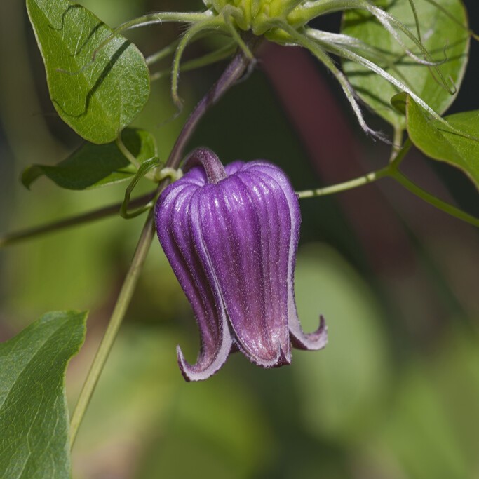 Clematis viorna, eller urnklematis, är en fascinerande klätterväxt som tillför trädgården ett unikt och charmigt inslag med sina urnformade, enkla och nickande blommor. Blommorna är små, med en diameter på cirka 2–3 cm, och har en vacker lavendel- till purpurfärg. Blombladen avslutas med bakåtböjda spetsar som är krämfärgade till vita, vilket skapar en subtil kontrast och förstärker blommans eleganta form. De tjocka, vaxartade kronbladen behåller sin form under hela blomningssäsongen, som varar från sommaren till tidig höst.Bladverket är frodigt och grönt, med lätt flikade blad som ger en luftig och dekorativ bakgrund för de nickande blommorna. På hösten kan bladen få en mild gulaktig ton, vilket ger ytterligare färg och textur när blomningen avtar. Med en höjd på upp till 2–3 meter är Clematis viorna perfekt för spaljéer, staket eller naturliga trädgårdar där den kan klättra upp i mindre träd och buskar.Plantera Clematis viorna i väldränerad, något fuktig jord i ett soligt eller halvskuggigt läge för bästa resultat. Den blommar på nytt trä, vilket gör beskärningen enkel och garanterar riklig blomning varje säsong. Urnklematis är en tålig och anpassningsbar klematis, idealisk för trädgårdsentusiaster som uppskattar en naturlig och vild karaktär. Med sina unika, nickande blommor och robusta växtsätt är Clematis viorna ett utmärkt val för en trädgård med karaktär och variation.