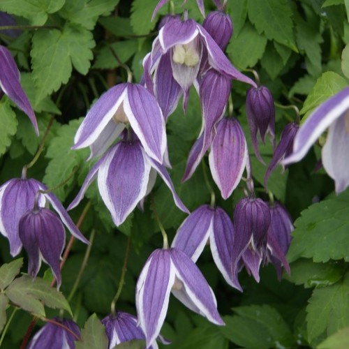 Tuote Kuvaus:Clematis atragene 'Blue Eclipse' är en elegant och tidigblommande klätterväxt som tillför trädgården en förtrollande färgkombination. Blommorna är klockformade, nickande och har en djup blå nyans med en distinkt vit kant längs kronbladens ytterkant, vilket skapar en slående kontrast och ett unikt, tvåfärgat utseende. Varje blomma är cirka 5–7 cm i diameter och har vågiga kronblad som ger ett fylligt och mjukt uttryck. Blommornas centrum pryds av ljusa ståndare som harmonierar med den vita kanten och förstärker blommans eleganta utseende. 'Blue Eclipse' blommar från tidig vår till försommaren, vilket gör den till en av de första klätterväxterna att lysa upp trädgården med sin färgglada skönhet.