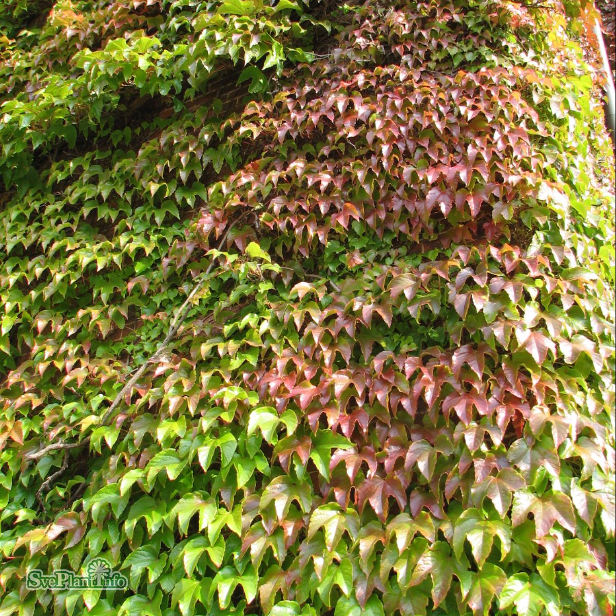 grönvit, maj-juni, små svarta bär efter blomning, vinröd höstfärg, treflikiga blad, 6-10m, sol, skugga, zon 1-4, klättrar med sugfötter.