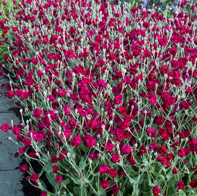 mörkrosa, fylld, gråa blad, 60cm, juni-aug, sol, frösår sig.A