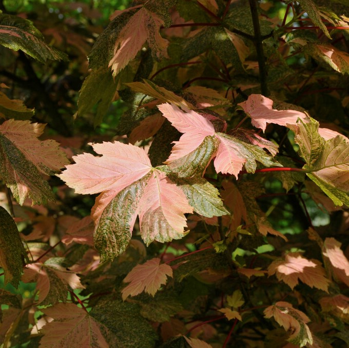 vitgrön brokiga blad, nya blad rosagrönvita, gulgrön, april-maj, gulorange höstfärg, 2-2,5m, sol, halvskugga, zon 1-5.