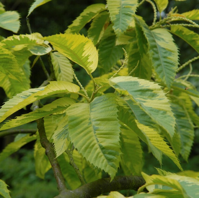 Castanea sativa 'Variegata' (Aureomarginata) har sitt ursprung i Europa och är en sällsynt kultivar av den äkta kastanjen. Den är särskilt uppskattad för sitt unika brokiga bladverk och sin mångsidighet, vilket gör den till ett populärt val för både trädgårdar och offentliga planteringar.
