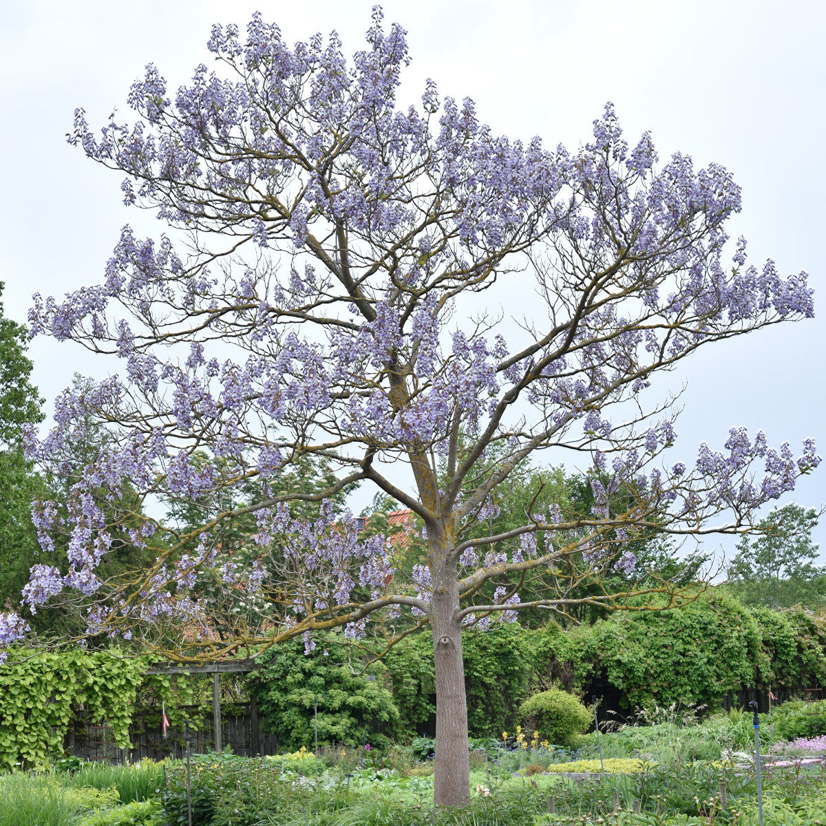 Paulownia tomentosa, kejsarträd, är ett snabbväxande, lövfällande träd med ett brett, rundat växtsätt och exotiskt utseende tack vare sin imponerande bladstorlek och spektakulära blomning. Bladen är stora, hjärtformade till brett äggrunda, ofta upp till 40 cm i diameter, med mjuk, filtartad undersida. I maj till juni, innan eller samtidigt med bladutspring, slår de stora, ljust violettblå blommorna ut i täta, upprätta klasar – varje blomma är cirka 5–6 cm lång, trumpetformad och doftar svagt. Blommorna liknar digitalis och lockar pollinatörer. Trädet får kapselliknande frukter som sitter kvar under vintern.