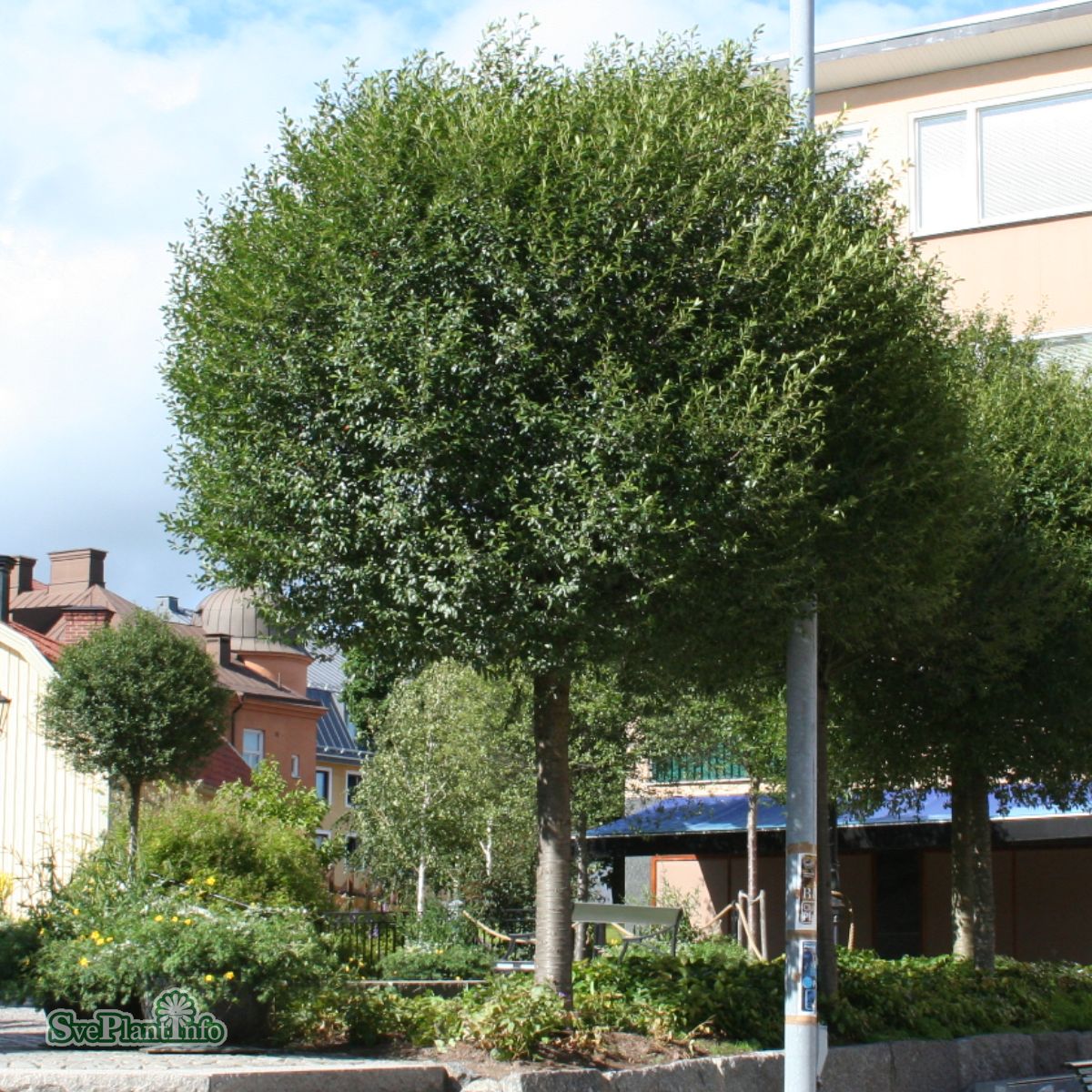 Tuote Kuvaus:Prunus × eminens ‘Umbraculifera’ är ett kompakt klotkörsbär i trädform med 80 cm hög ympad stam och en naturligt bollformad, tätvuxen krona som bevarar sin form utan regelbunden beskärning. Trädet blommar i april till början av maj med små, vita enkla blommor som sitter i knippen längs grenarna. Blomningen är diskret men dekorativ, särskilt när den sker samtidigt med bladsprickningen. Bladverket är glänsande grönt, äggrunt till elliptiskt och får vackert gulorange höstfärg. Trädet sätter endast obetydligt med frukt och är därför rent och lättskött i urbana miljöer.
