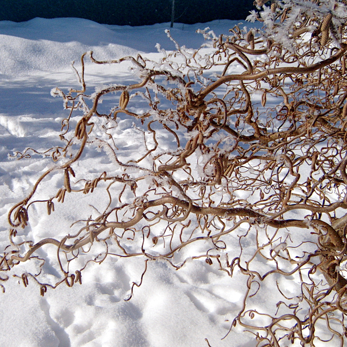 Corylus avellana 'Contorta', ormhassel, är ett lövfällande, småväxt prydnadsträd med starkt vridna grenar och ett unikt skulpturalt växtsätt som ger karaktär året om. I ympad form på 120 cm stam bildar den en förtätad, något oregelbunden krona där grenarna slingrar sig ormlikt i alla riktningar. Bladen är brett äggrunda, friskt gröna med grovt sågad kant och får varmgula höstfärger innan de fälls. Under sensvinter till tidig vår slår långa, ljusgula hanhängen ut på bar kvist och förstärker grenverkets grafiska effekt. Grenarna förblir dekorativa även utan löv, vilket gör trädet till ett starkt vinterelement i planteringen.