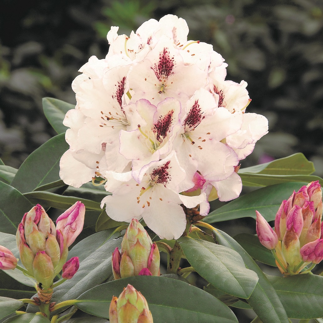 **Rhododendron yakushimanum 'Gudrun'** är en förtrollande parkrododendron som bjuder på stora, vita blommor med en subtil rosa ton längs kanterna. Det övre kronbladet pryds av en mörk, dramatisk fläck, vilket ger blommorna ett unikt och sofistikerat utseende. Blommorna, som framträder i maj och juni, samlas i täta klasar och skapar ett strålande inslag i trädgården.