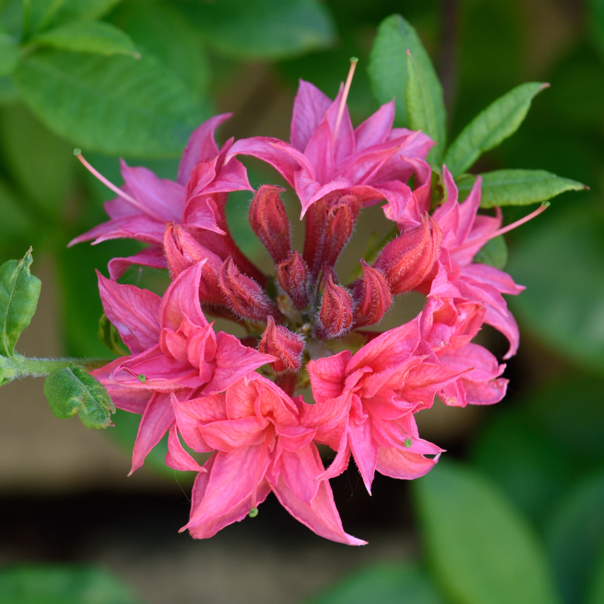 På hösten övergår bladverket till en imponerande rödlila färg, vilket tillför ytterligare ett dekorativt inslag under årets senare månader. Denna trädgårdsazalea blir cirka 1,5–2 meter hög och trivs bäst i surjordspartier i soliga till halvskuggiga lägen. Plantera gärna i väldränerad, näringsrik jord för att uppnå maximal blomprakt. **'Homebush'** är en härdig och lättskött azalea som imponerar med sin starka färgpalett och fylliga blommor året runt.
