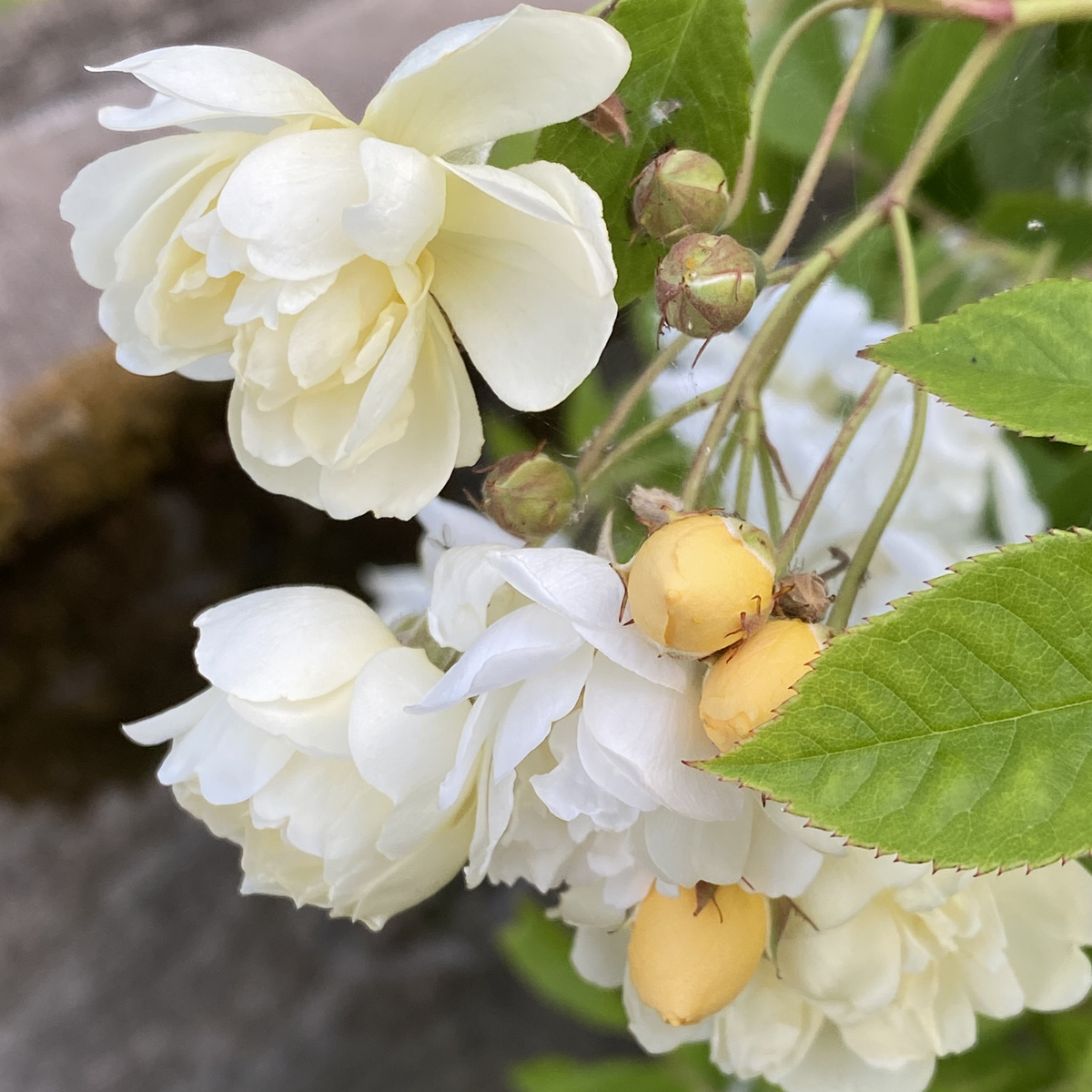 Rosa helenae 'Christine Helene' är en charmig och kraftfull klätterros som förvandlar varje pergola, spaljé eller vägg till en blommande dröm. Dess små, halvfyllda blommor sprider sig i klasar och skiftar i mjukt crèmevitt med en mild gul mitt. Doften är ljuvlig, med en söt och fruktig karaktär som lockar fjärilar och bin. Under hösten pryds busken av dekorativa, orange nypon som tillför ytterligare skönhet och intresse.