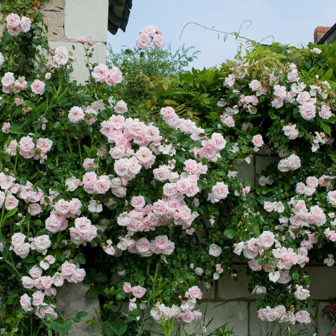 New Dawn' är en klassisk och älskad klätterros med stora, halvfyllda blommor i mjukt ljusrosa som bleknar till nästan vitt. Den blommar kontinuerligt från tidig sommar till sen höst och sprider en mild, söt doft som förhöjer trädgårdens atmosfär. Rosens långa, böjliga grenar gör den perfekt för att täcka spaljéer, pergolor eller murar, och den passar även utmärkt som solitärbuske.